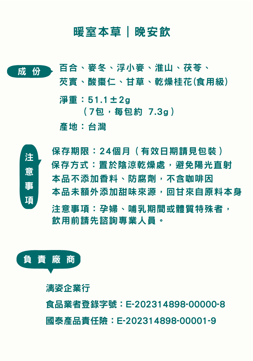 晚安飲專門設計為睡前飲用,作為一天結束前的溫和陪伴