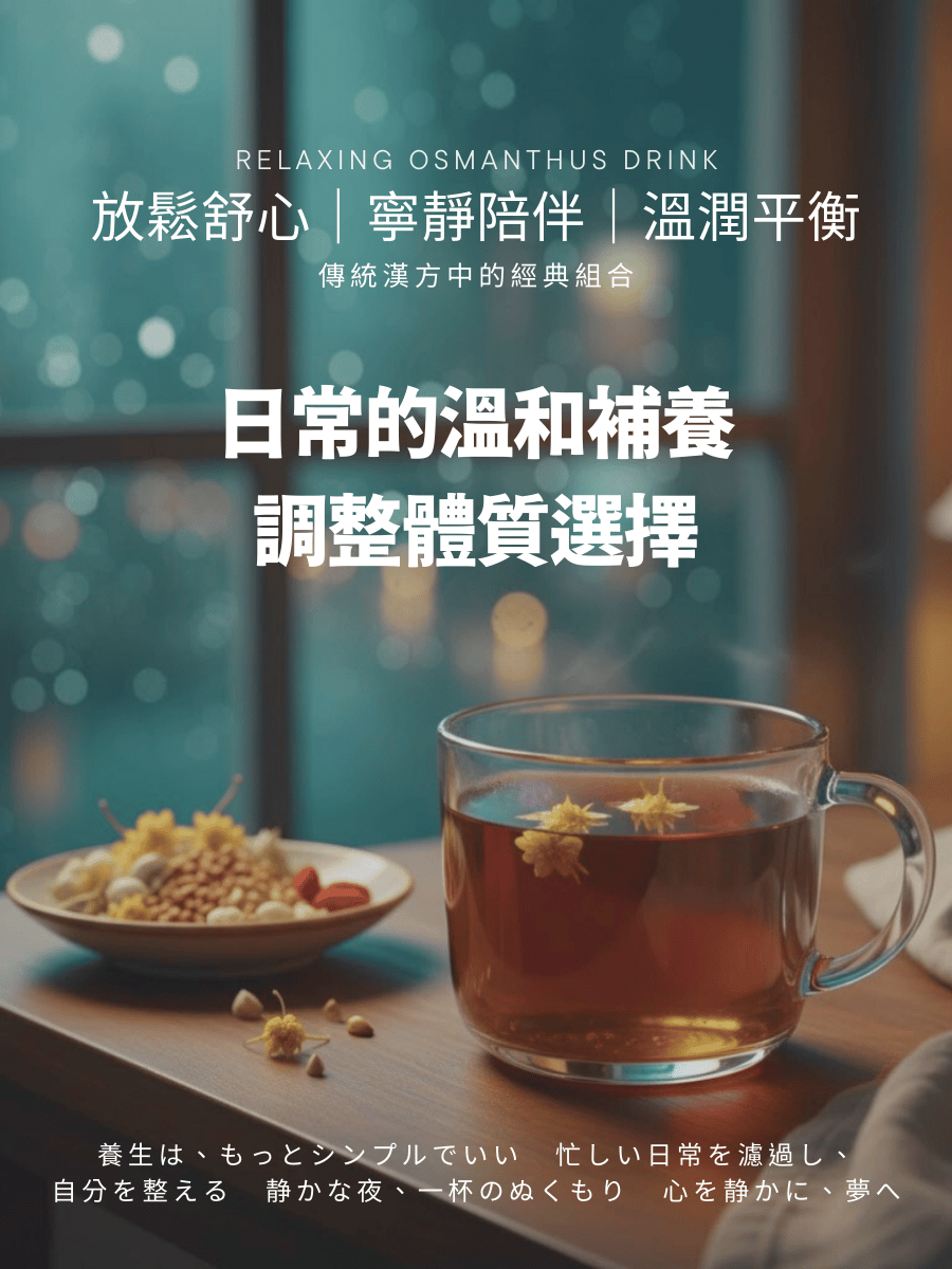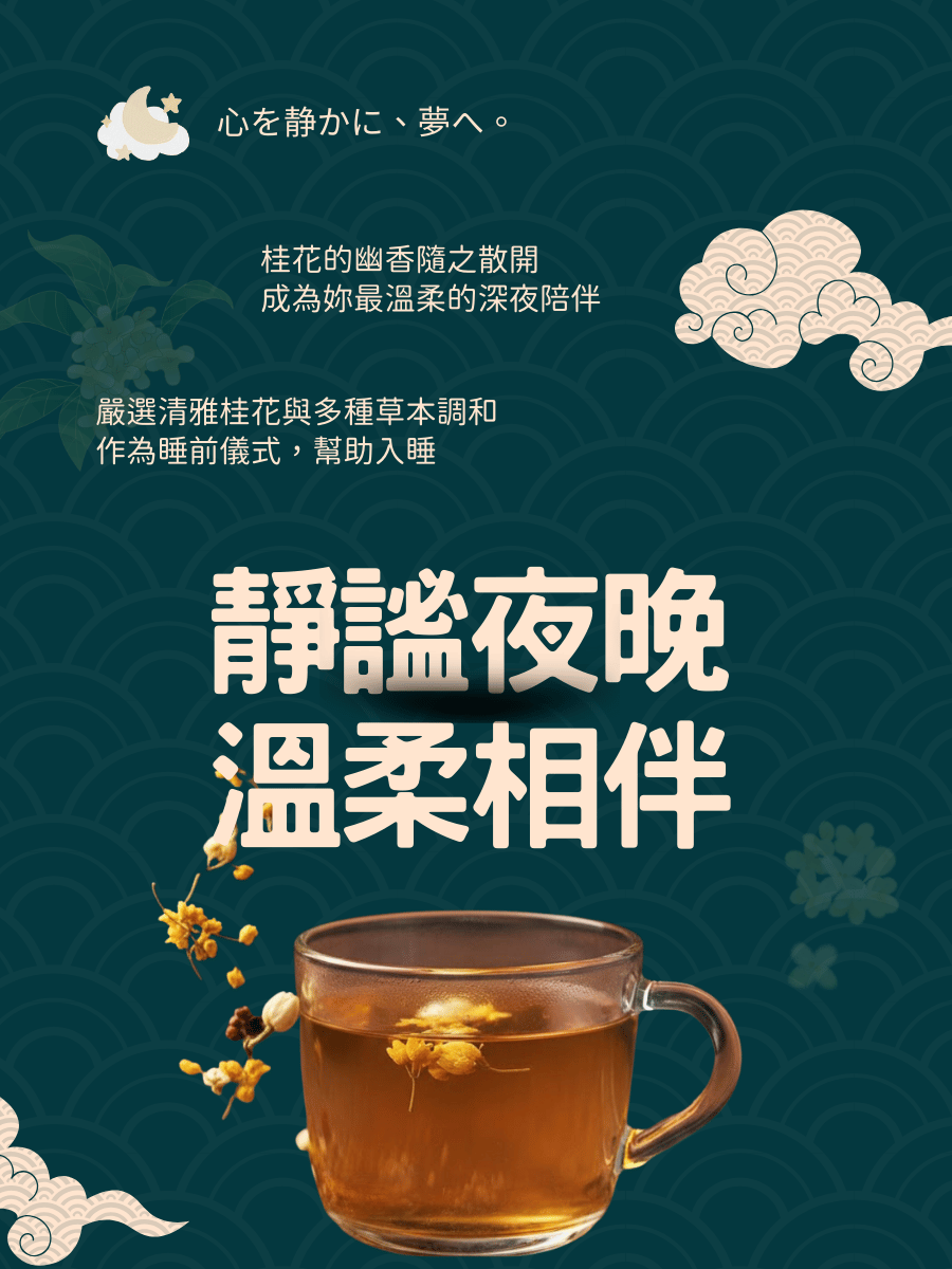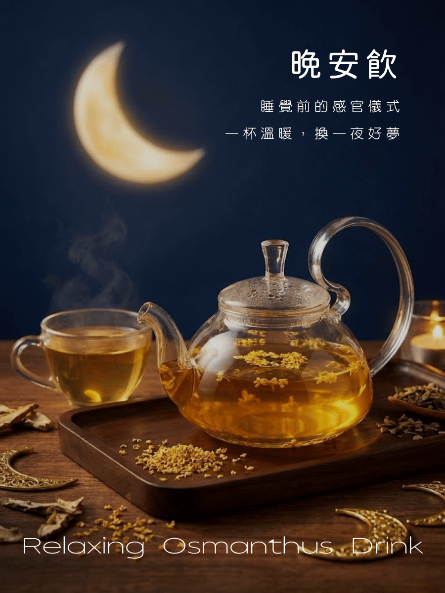晚安飲、晚安茶、暖室本草、桂花茶、桂花草本茶、草本茶包、睡前草本茶、幫助入睡、無咖啡因茶包、睡前儀式茶、夜晚飲用茶